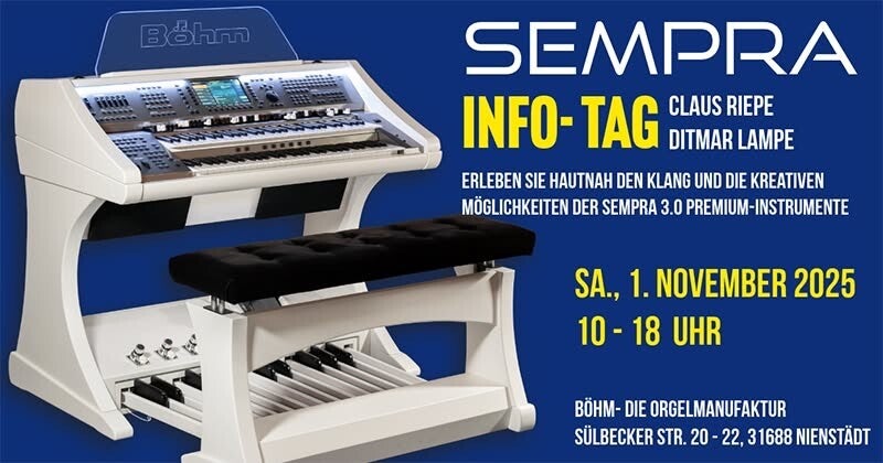 Jelle van Marrum van JVM-Music in Hummelo, zal dan op een van de nieuwe serie Sempra-orgels van Böhm concerteren en een demonstratie geven van de mogelijkheden. Bovendien komt ook de bekende Duitse Böhm-organist Claus Riepe van de firma Keyswerk. Een unieke gelegenheid om hem te beluisteren.